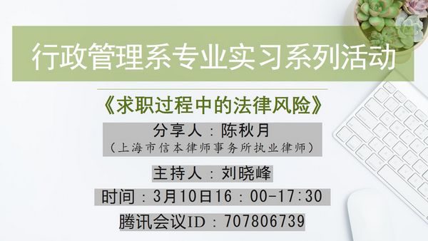 3月10日下午,社会与人口院线上实习系列首场讲座“求职过程中的法律风险”,在线上会议平台上成功举行。本次活动,邀请到了上海市信本律师事务所执业律师陈秋月律师作为嘉宾,围绕“成为有竞争力的求职者”的主题进行了一场精彩报告。本场报告由学院领导刘晓峰老师主持。