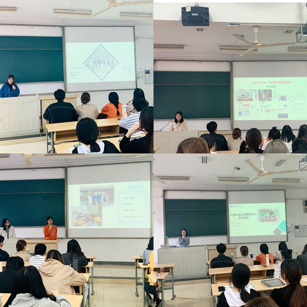 4位主讲人首先分别从“医务社工、老年社工、儿童社工、社会组织”四个领域介绍社会工作介入的调研策划、服务方案设计、创意活动开发等多个维度的实习经历。其次,就实习过程中的所见所闻分享各自关于社会工作实践的收获与反思。最后,同学们就实务方面的问题进行提问。不少同学表示,本次周期性社工实务沙龙在所学理论知识的基础上延伸出新的认知视角,对已学习的知识体系有了新的反思。