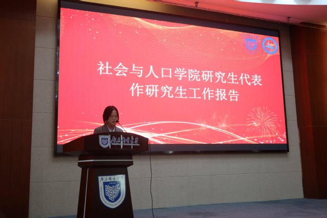 奏唱国歌后,学院2019级研究生刘兰婷同学作为代表做题为“锐意进去,奋辑笃行——努力开创研究生会新局面”的工作汇报。她汇报了过去一年学院开展的各类研究生特色活动和学术创新论坛,结合当下情况,对学弟学妹们寄予祝福,并对第一届研究生会的未来发展提出建议和展望。