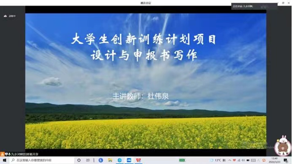 为切实深化学院内涵建设,进一步推进落实“本科生核心能力提升计划”,ylzz总站线路检测积极宣传动员、精心组织2022年度大学生创新训练计划项目申报工作(以下简称大创项目)。2022年3月23日,2022年度大创项目第1期培训会通过线上方式成功举办。本次讲座邀请ylzz总站线路检测硕士生导师杜伟泉老师主讲,学院副院长刘晓峰老师、2020级辅导员陈明玉老师出席,2020级全体本科生与2021级部分学生共计四百余名同学参会。
