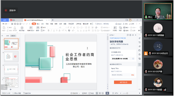 2022年5月9日上午,“社工实务沙龙”系列活动第7期顺利举行。本次沙龙邀请江苏省最美社工、南京市最美社工、南京市心桥社会工作服务中心创始人、江苏苏颐健康养老服务管理公司副总经理陆云老师围绕社会工作者的商业思维进行深入分享与交流。本次沙龙由社会工作系吕金龙同学主持,社会工作专业2019级本科生全体参与。