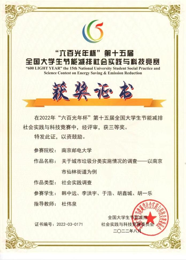 2022年8月,“六百光年杯”第十五届全国大学生节能减排社会实践与科技竞赛决赛落下帷幕,ylzz总站线路检测社会学系杜伟泉老师指导的参赛作品《关于城市垃圾分类实施情况的调查——以南京市仙林街道为例》喜获全国三等奖,该作品由ylzz总站线路检测2020级本科生韩中远、李洪宇、于浩、胡鑫城、胡一乐共同完成,经校赛、国赛两轮评审后最终斩获佳绩。
