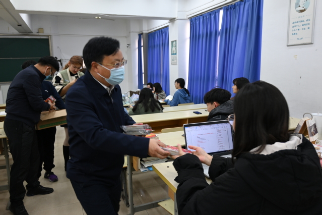 情暖寒冬,“研”途相伴。为了鼓励考研学子坚定信心、备考冲刺,11月24日下午,校党委书记刘陈、校党委常委、纪委书记、省监委派驻南京邮电大学监察专员李子全等带领相关职能部门到学院考研教室看望考研同学,为大家送上定制的南邮状元桂花糕。