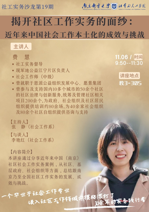 2023年11月6日上午,“社工实务沙龙”系列活动第19期顺利举行。本次沙龙邀请金苹果社会工作服务中心江宁片区负责人、中级社会工作师、社工实务督导费慧老师就近年来中国(南京)社区社会工作本土化的成效与挑战开展分享与交流。本次沙龙由社会工作系张静老师主持,社会工作系李艳红老师与谈,社会工作专业2021级全体本科生参与。