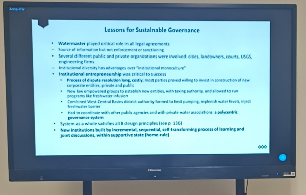 张老师由《公共事物的治理之道》一书的作者埃莉诺·奥斯特罗姆的介绍开始,引入对本次悦读会书目的讨论。张老师首先为大家介绍了本书的内容框架,将内容分为理论陈述、案例引入和分析框架呈现三部分。接着张老师对“公地悲剧”“囚犯困境”“集体行动的逻辑”三大理论模型进行了重点概述,重点讲解了核心概念,为同学们区别如公共池塘资源与公共物品、多中心治理与协同治理等专业术语提供了指导。随后张老师展示了书中呈现的部分案例,并围绕南加州地下水治理案例展开重点介绍和分析。最后,张老师主要从使用者的分配规则、对供应行为的共同维护、监督与制裁机制以及政策性激励总结自主治理公共池塘资源的分析框架,为同学们思考如何进一步实现对公共事物的有效治理提供启发。