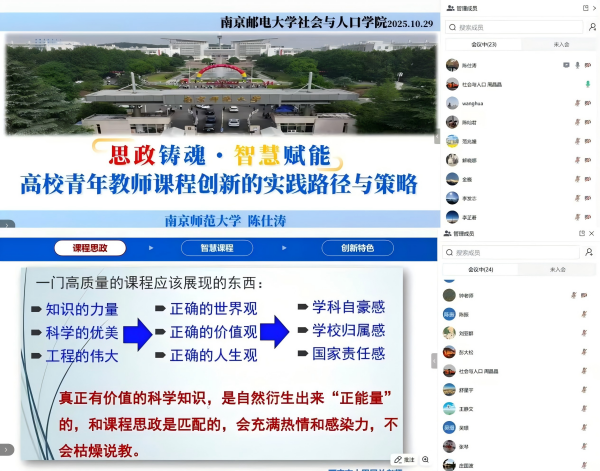 2025年10月29日,学院举办第七期“金讲台”教师育人能力提升系列沙龙活动。本次沙龙以“思政铸魂·智慧赋能——高校青年教师课程创新的实践路径与策略”为主题,特邀南京师范大学地理科学学院陈仕涛教授作专题讲解,活动由ylzz总站线路检测、社会工作学院副院长周晶晶主持,“课程思政”教学竞赛团队成员、督导组成员、各系主任、青年教师积极参与。