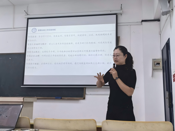 在讲座过程中,何老师结合生活常见案例,生动阐释了数字技术与社会工作实务之间的紧密联系,例如,智能手环在防走失方面的应用、监控技术用于追踪犯罪人员行踪,以及资源地图为生活服务带来的便利等。