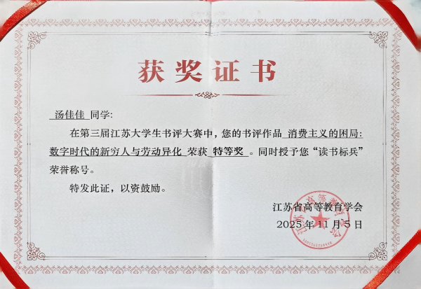 在书评大赛中,ylzz总站线路检测学子凭借对经典著作的深刻解读与独到见解脱颖而出:汤佳佳的作品《消费主义的困局:数字时代的新穷人与劳动异化》获特等奖,陈澜轩的《当我们谈论中国人时,究竟在谈论什么——读〈吾国与吾民〉》和毛文清的《战争回环与人性微光——〈五号屠场〉有感》获一等奖,顾佳凝的《原应恣意,终却叹息——“红楼四春”之二:迎春VS探春》获二等奖,上述获奖学生均被授予“读书标兵”称号。作为获奖学生代表,汤佳佳同学在闭幕式现场发言,分享了自己的阅读心得与创作感悟。这些成绩的取得,是学院长期深耕阅读育人工作、系统推进文化建设的重要成果,其中“本-硕联合悦读会”发挥了关键的支撑与培育作用。