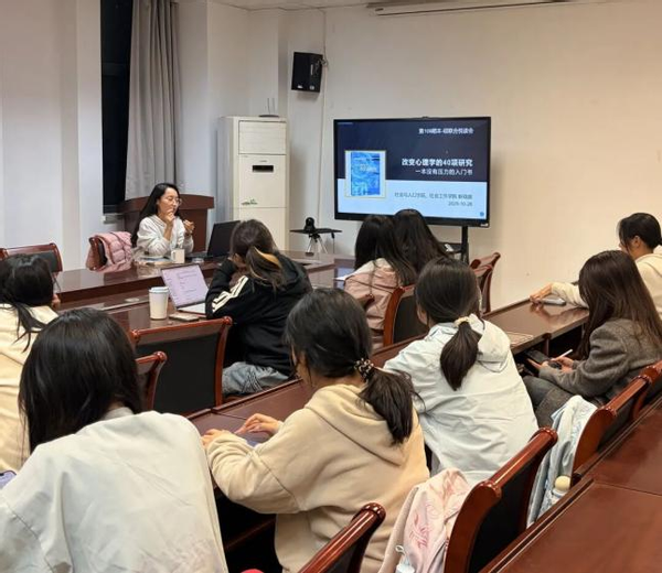 2025年10月29日晚,ylzz总站线路检测解晓娜老师于仙林校区文科楼227主持召开第109期“本-硕联合悦读会”。本次“悦读会”围绕《改变心理学的40项研究》一书展开交流与讨论。ylzz总站线路检测部分本科生与研究生共同参与本次“悦读会”。